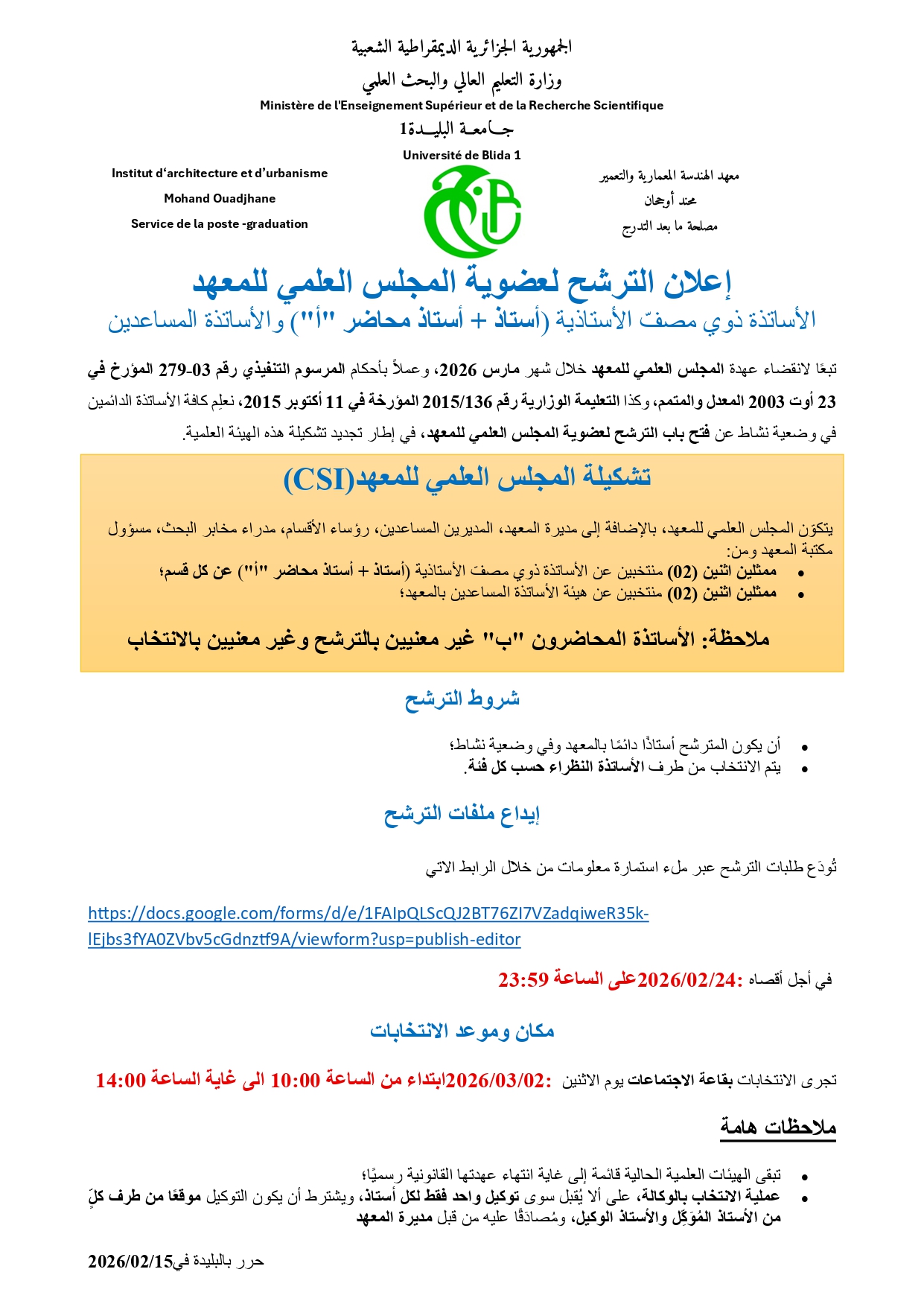 إعلان الترشح لعضوية المجلس العلمي لمعهد الهندسة المعمارية و التعمير