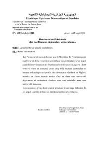 تسلّم وزارة التعليم العالي والبحث العلمي عرضًا يتضمّن خمس (05) منح دراسية في مرحلة الدكتوراه، مقدّمة من جامعة جنوب إفريقيا «University of South Africa (UNISA)» لفائدة الطلبة الجزائريين الراغبين في مواصلة دراساتهم ما بعد التدرج.