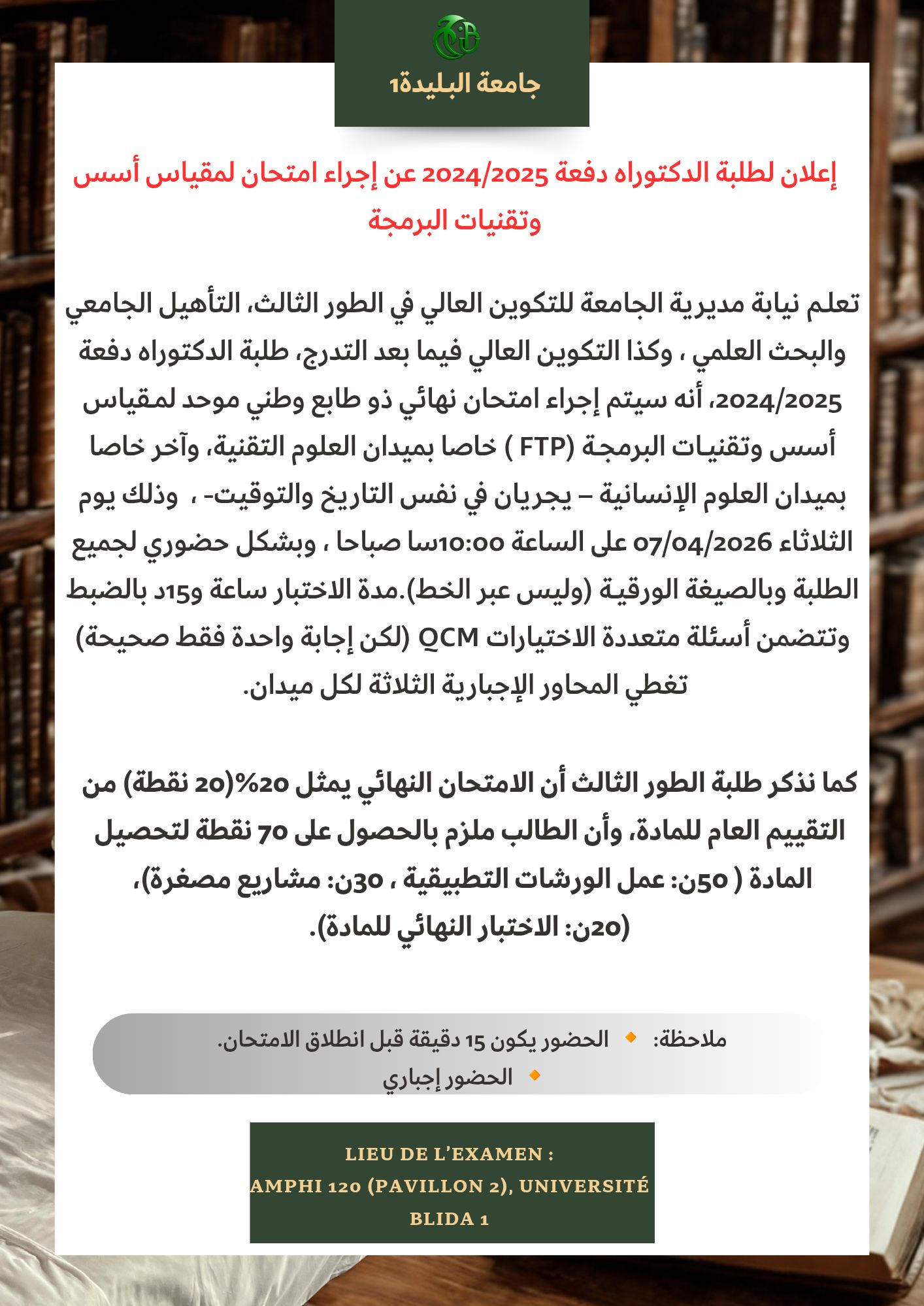 إعلان لطلبة الدكتوراه دفعة 2024-2025 عن إجراء امتحان لمقياس أسس وتقنيات البرمجة ( FTP)