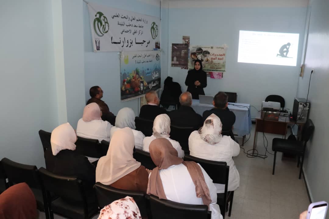 نظّم المركز الطبي الاجتماعي لجامعة البليدة1، نهار الاثنين 13 أفريل 2026 بمقر المركز، يوماً تحسيسياً لفائدة الأسرة الجامعية، خُصص للتوعية بمخاطر التدخين وتعاطي المخدرات، وهذا بحضور أسرة الجامعة وعلى رأسهم نائب مدير الجامعة المكلف بالتنمية والاستشراف الدكتور آيت سعدي محمد حسين ممثلا للسيد مدير الجامعة