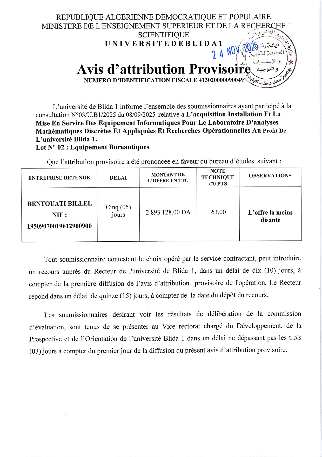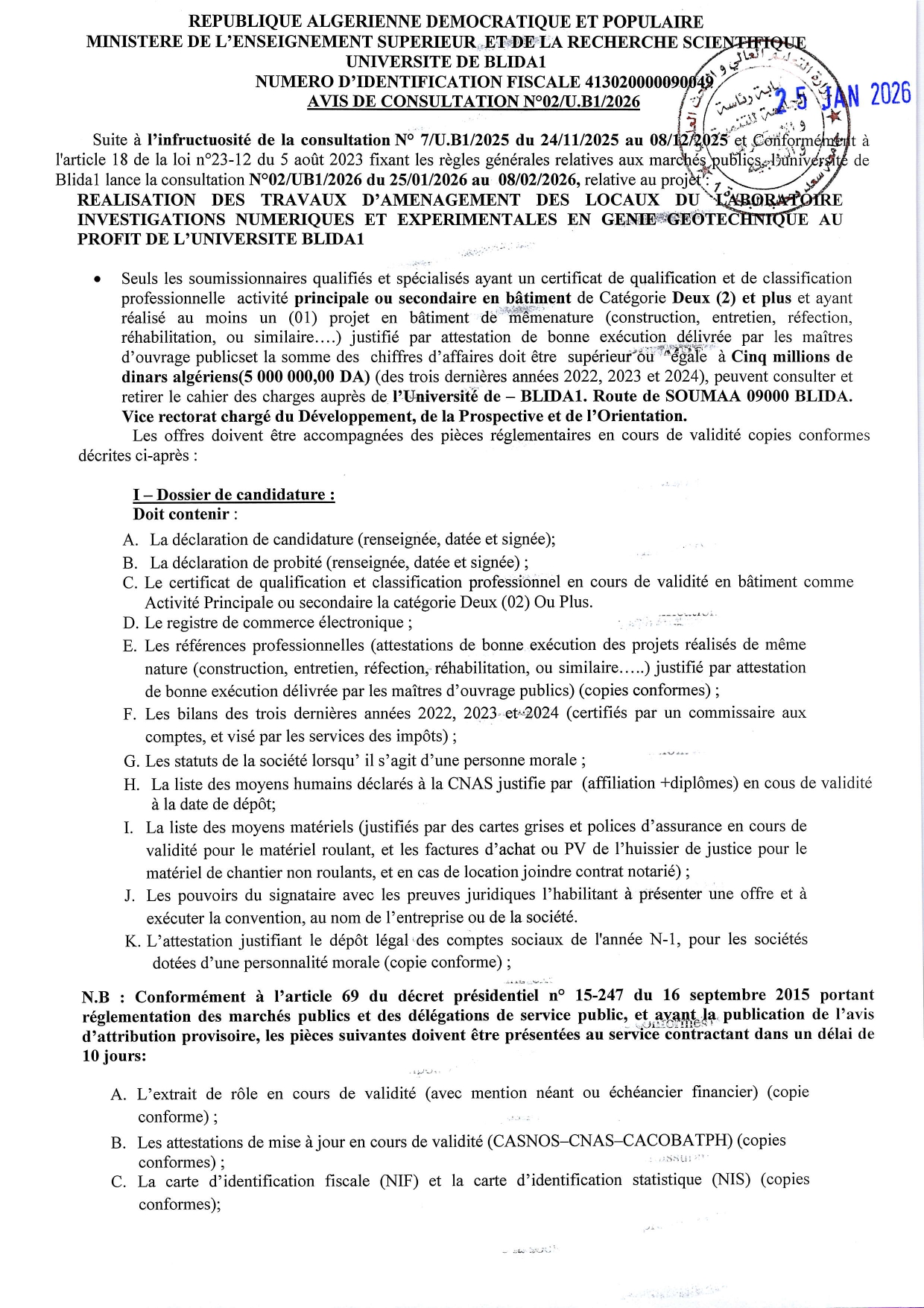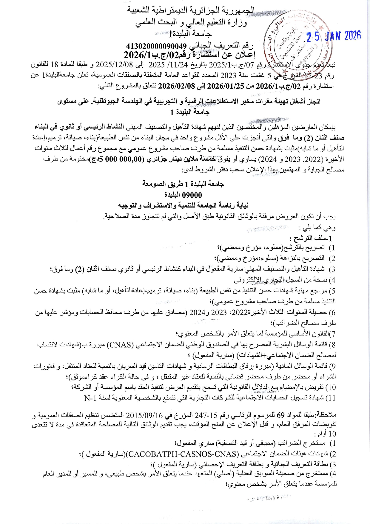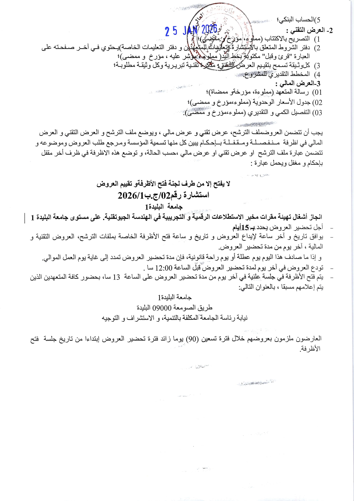 إعلان عن استشارة رقم 02/ ج.ب 1 / 2026