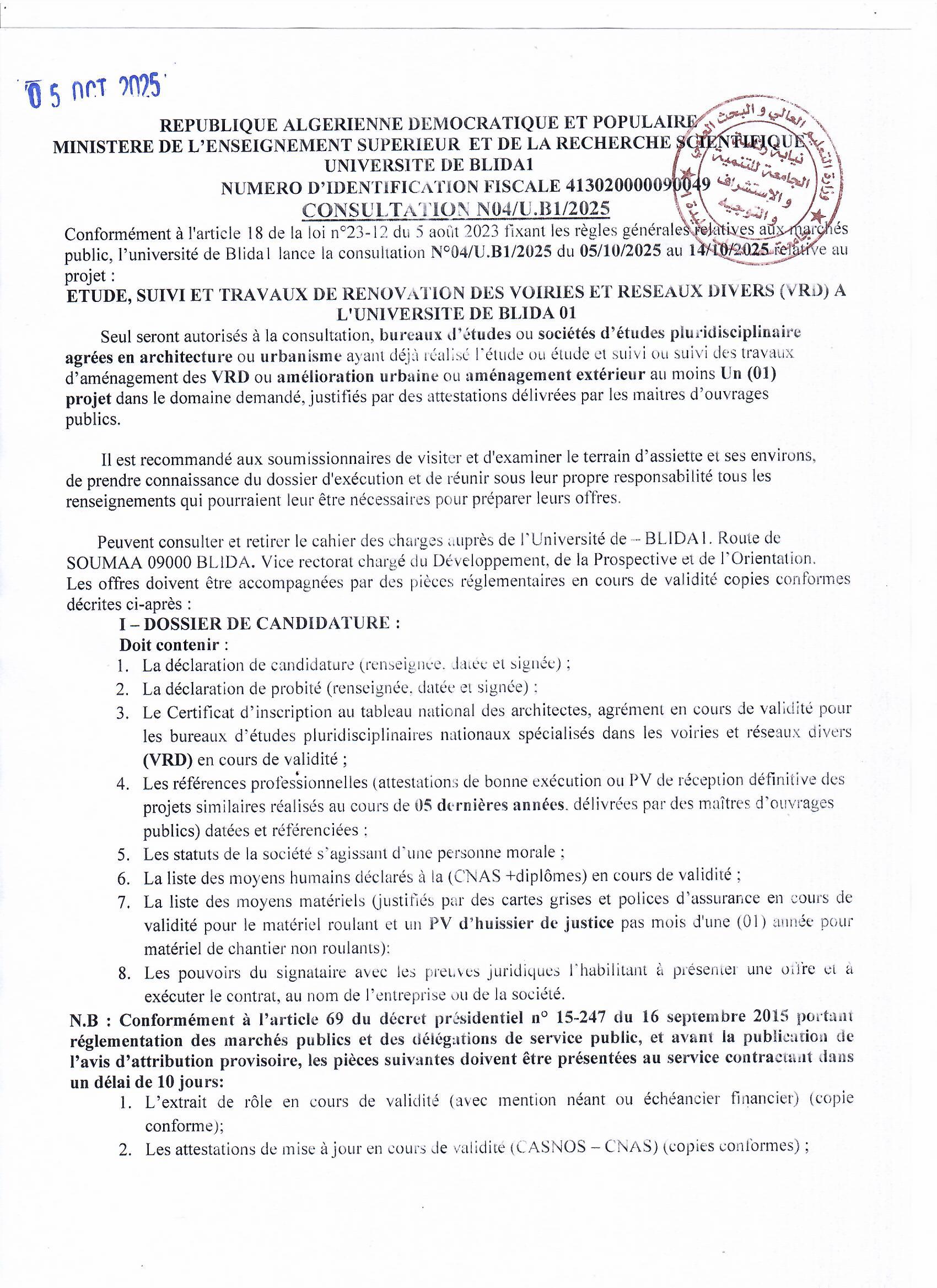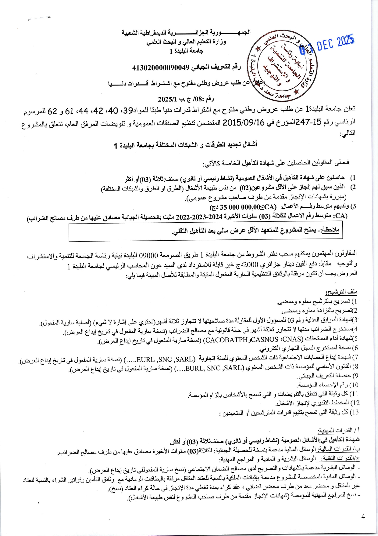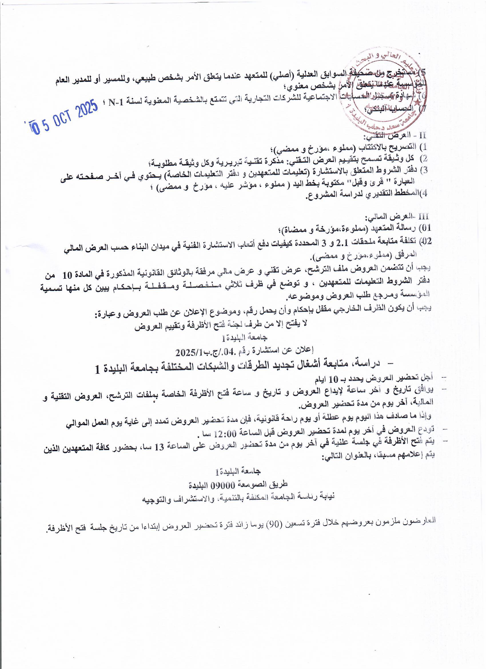 إعلان عن استشارة رقم 04/ج-ب 1-2025