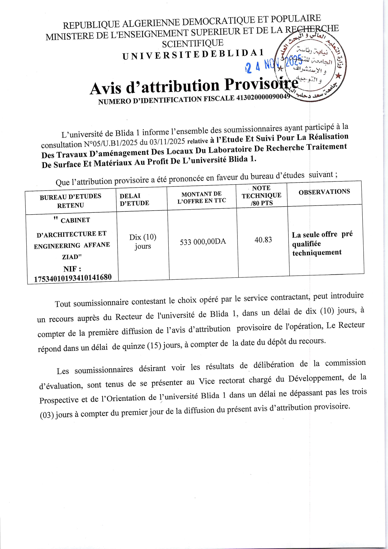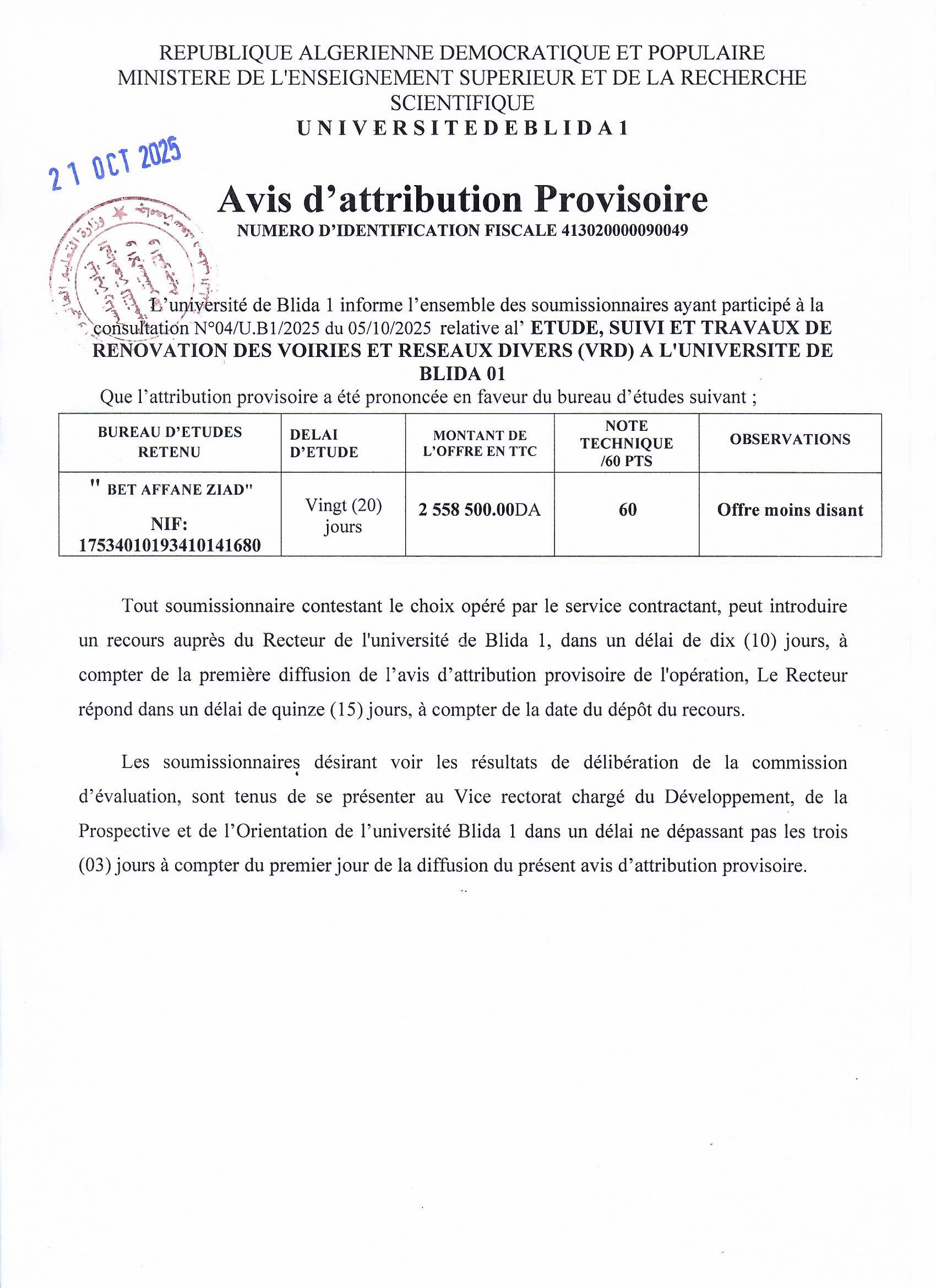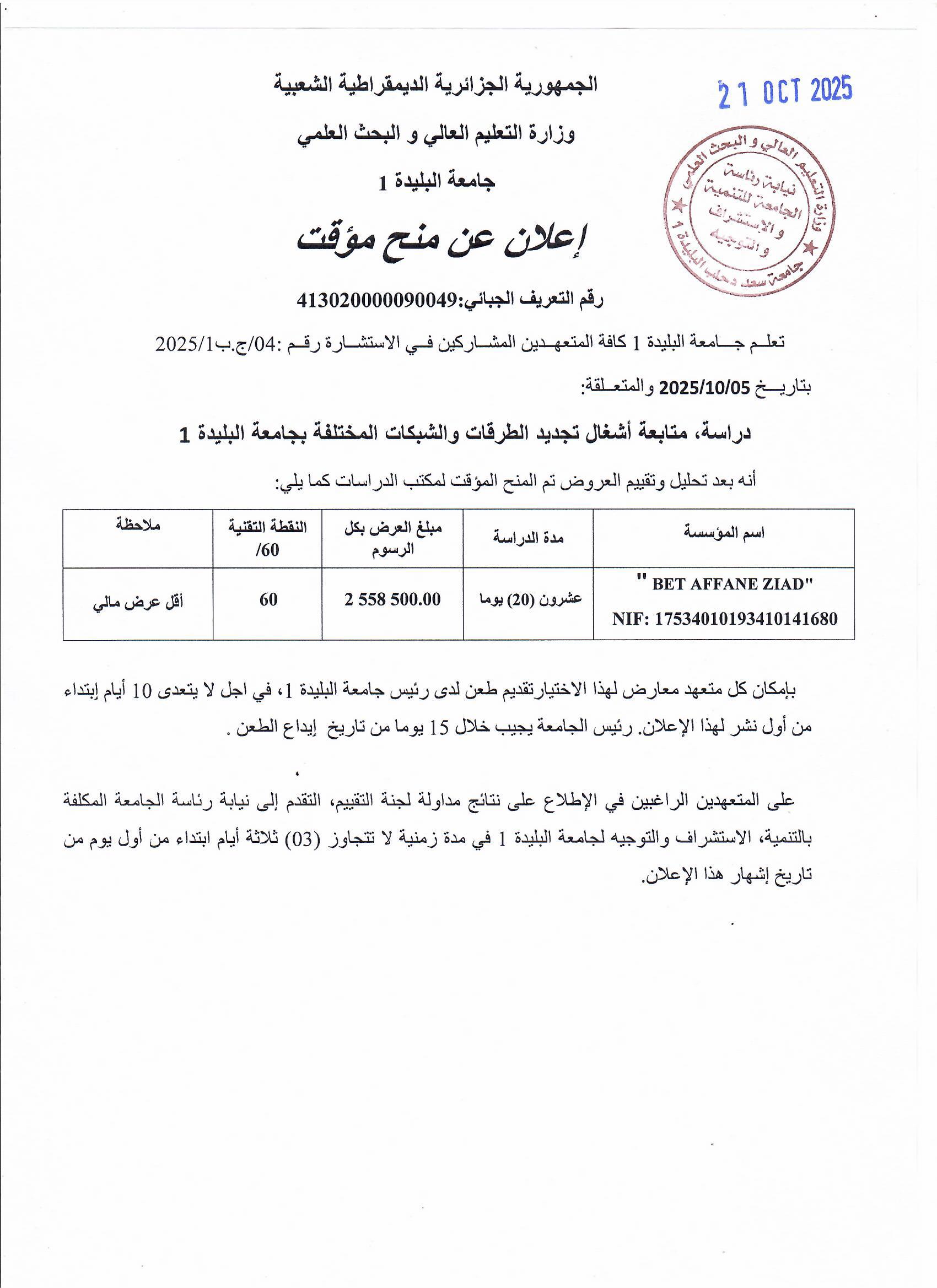 إعلان عن استشارة رقم 04/ج-ب 1-2025