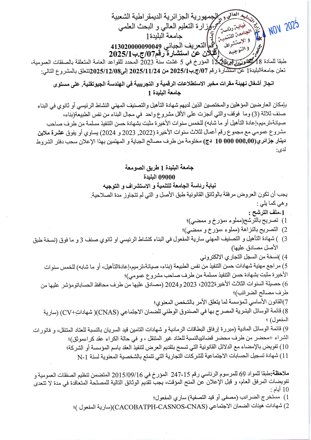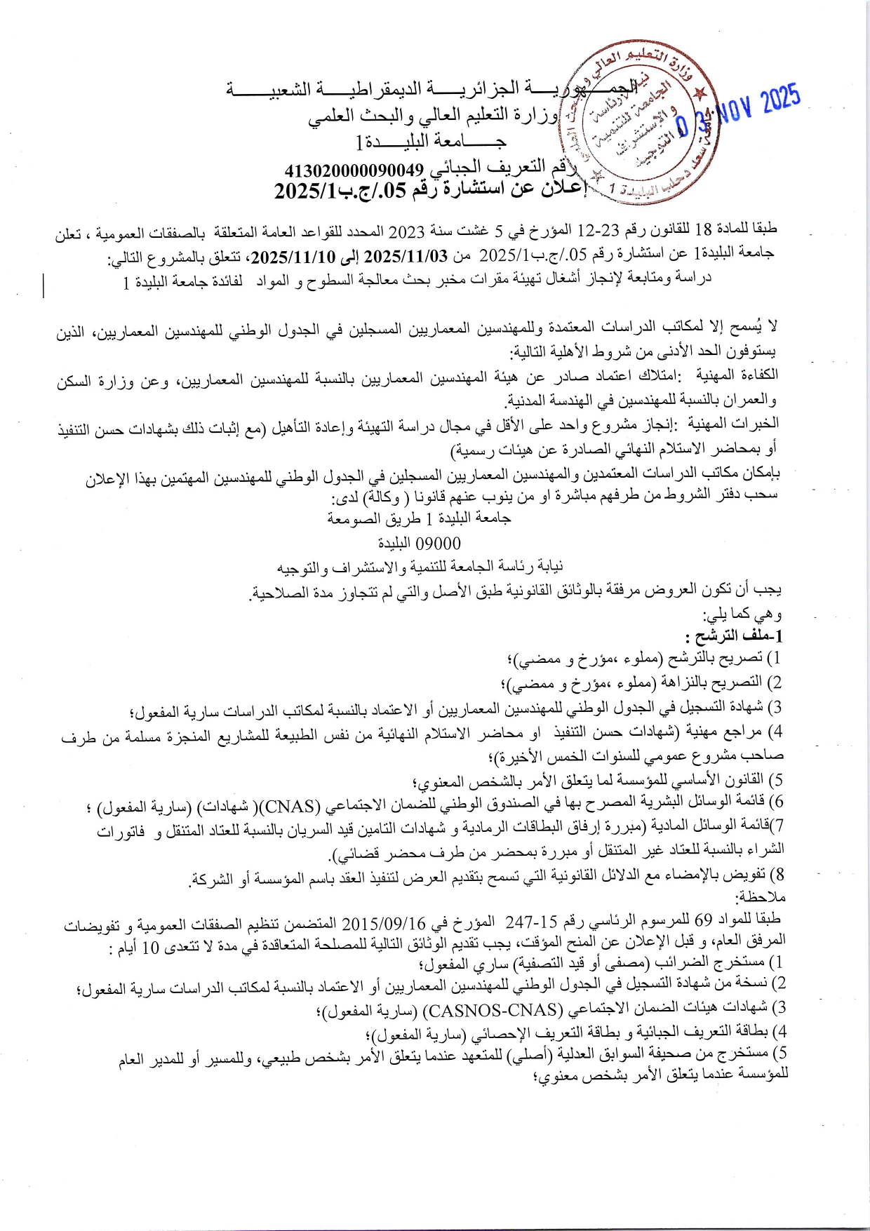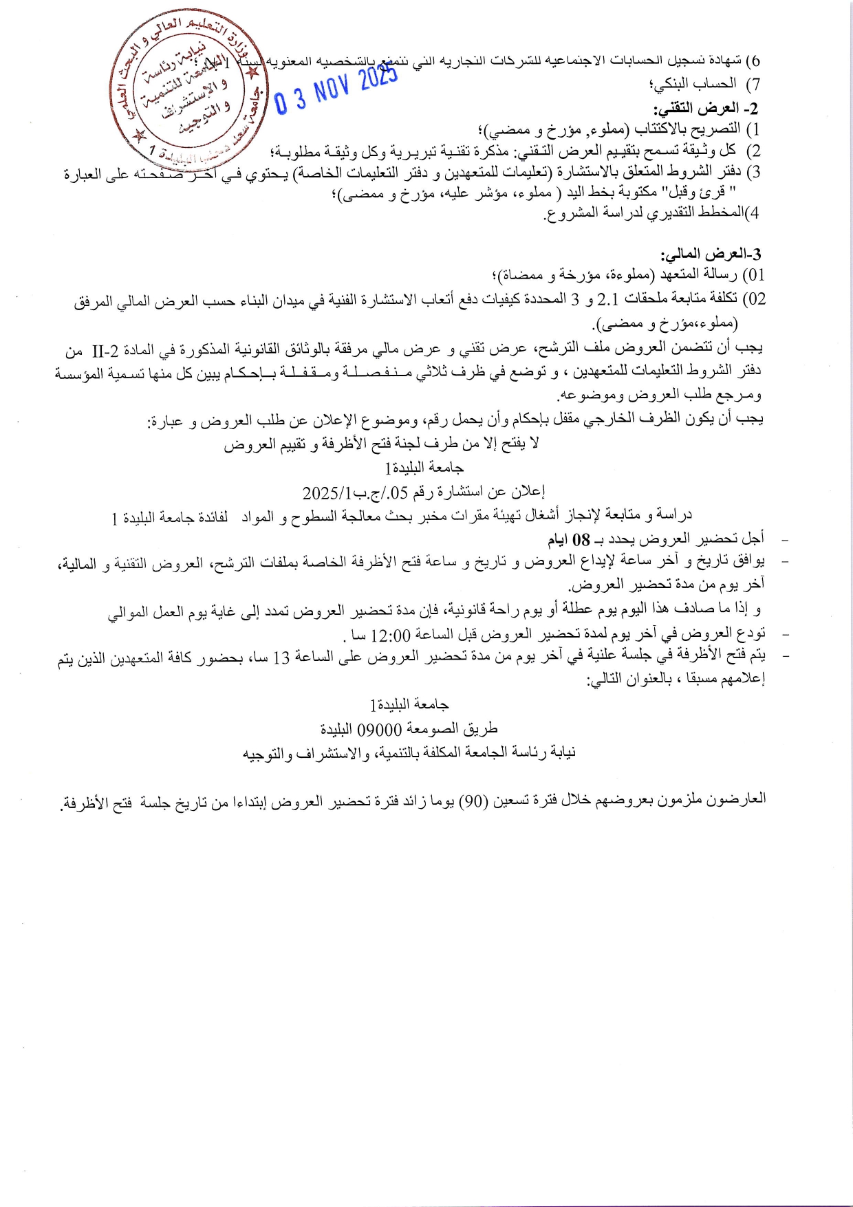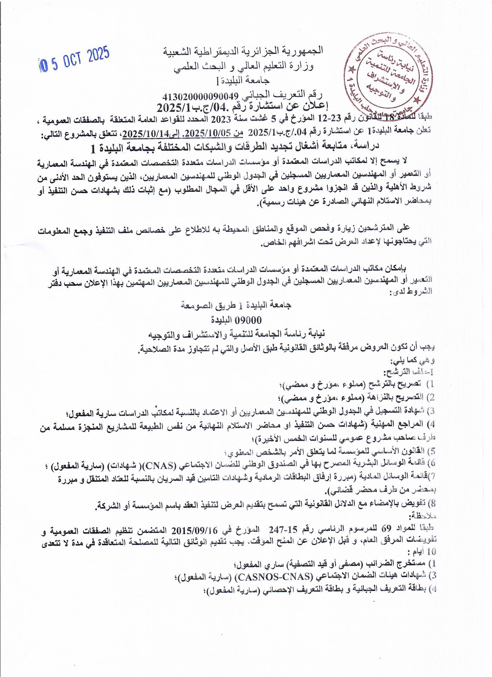 إعلان عن استشارة رقم 05/ج-ب 1-2025