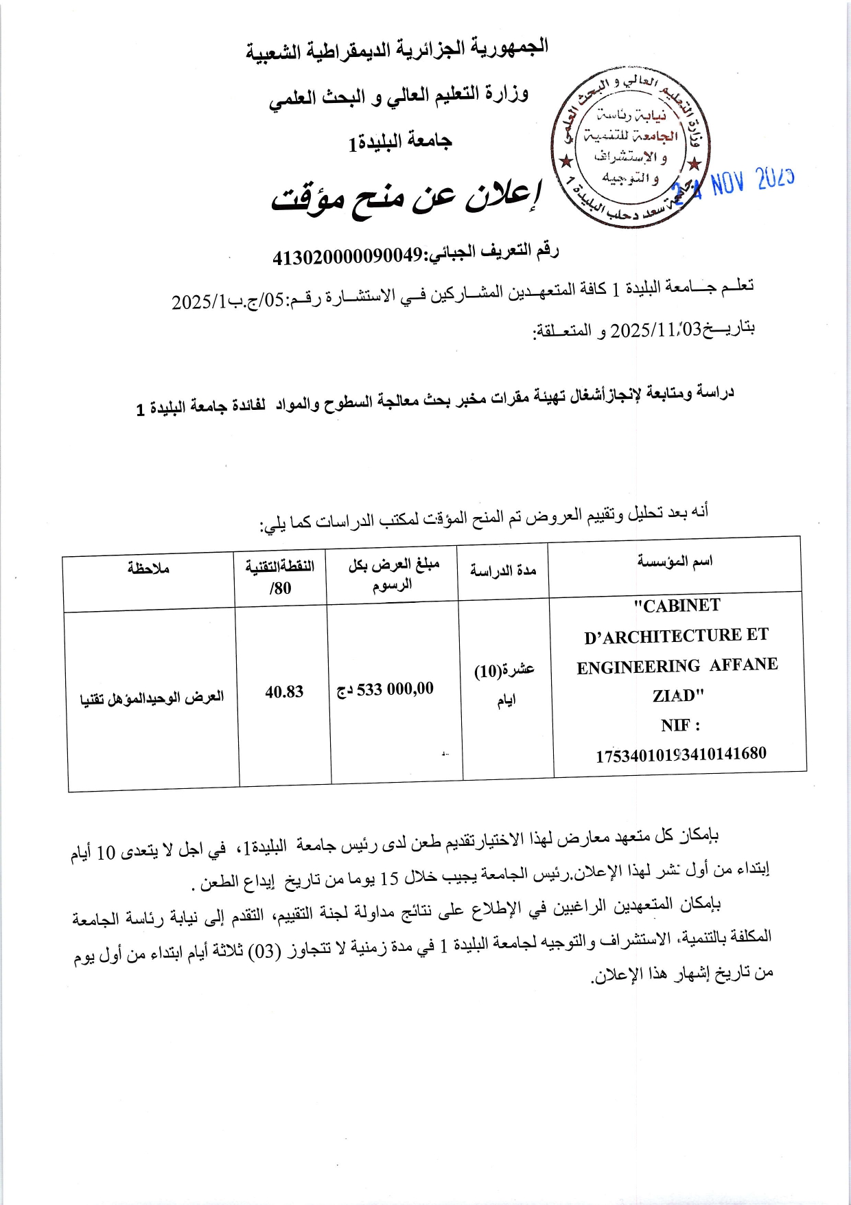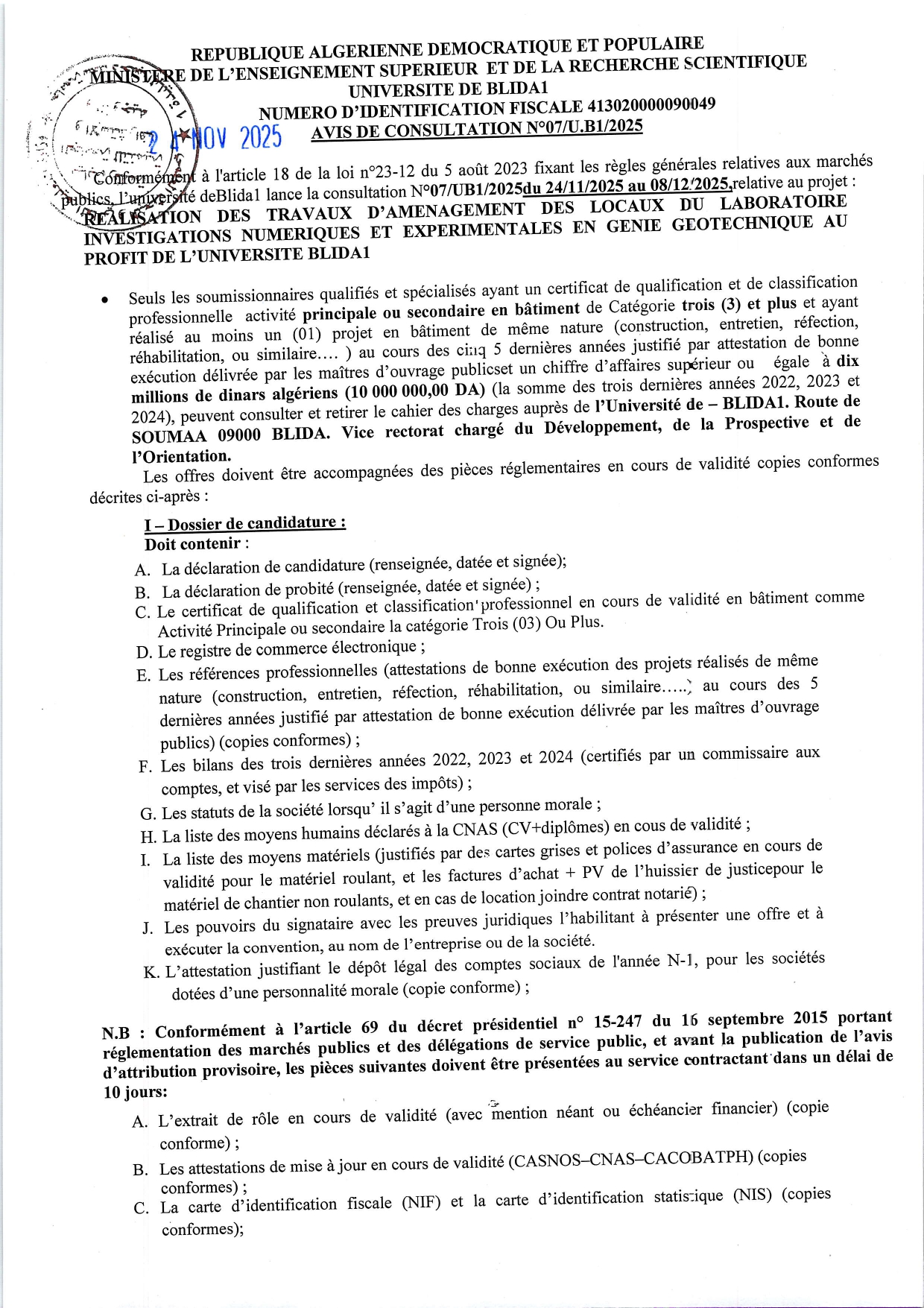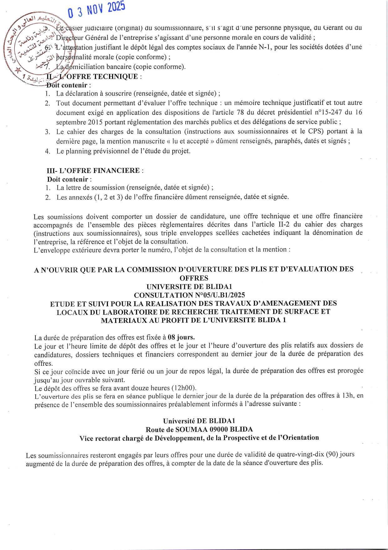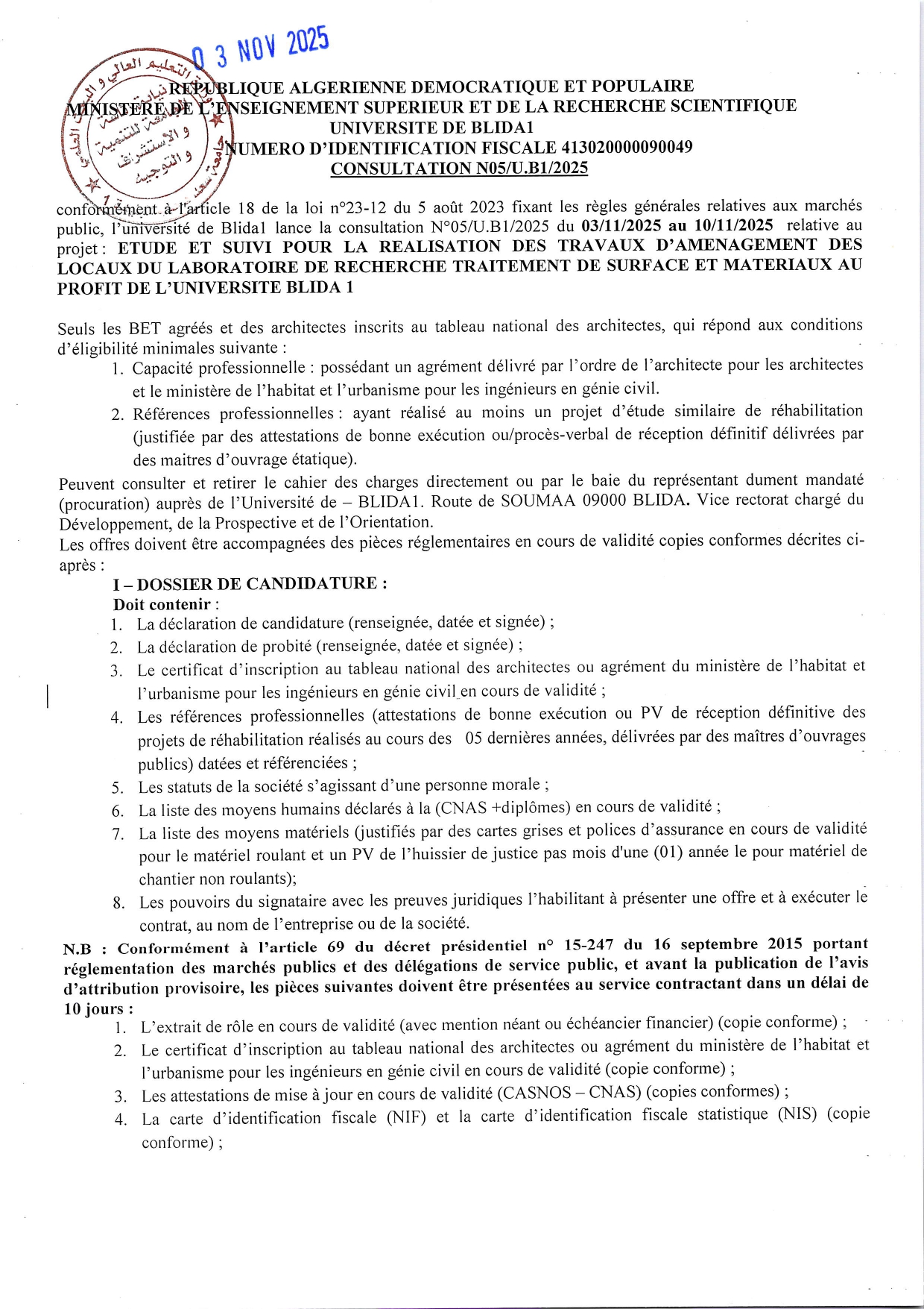 إعلان عن استشارة رقم 05/ج-ب 1-2025