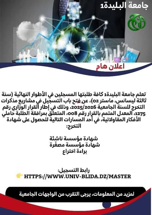 في إطار التحسيس بالتوجيهات الجديدة المتعلقة بريادة الأعمال وبالمرسوم رقم 1275 الخاص بمشاريع نهاية الدراسة (المؤسسات المصغرة والمؤسسات الناشئة)، يسرّنا أن ندعوكم لحضور لقاء تحسيسي.
