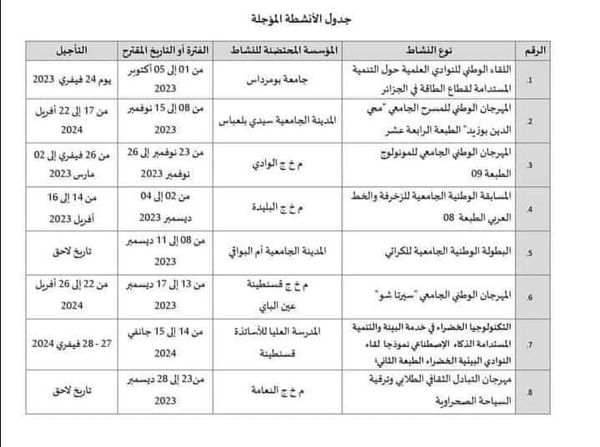 يُدعى طلبة كلية التكنولوجيا (إناث وذكور) الراغبون في المشاركة في هذه الأنشطة إلى التقرب من مصلحة الأنشطة العلمية والثقافية والرياضية، الكائنة بالجناح رقم 24، من أجل التسجيل.